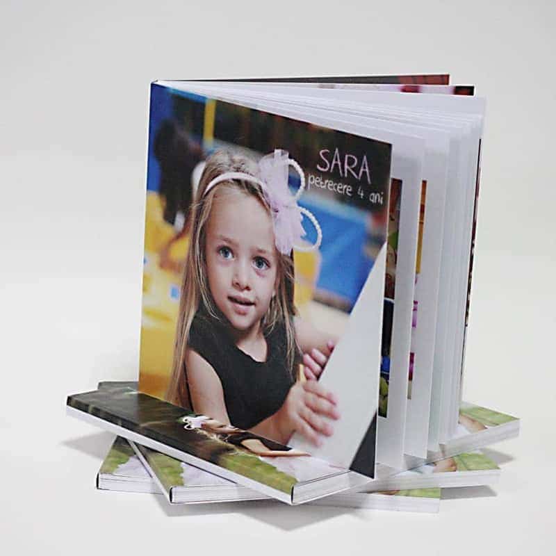 Coperta este realizată din print foto laminat mat și carton moale. Are exact dimensiunile blocului de album. Potrivită pentru albumele de mici dimensiuni (botez, vacanță) sau pentru duplicate ale albumelor principale.